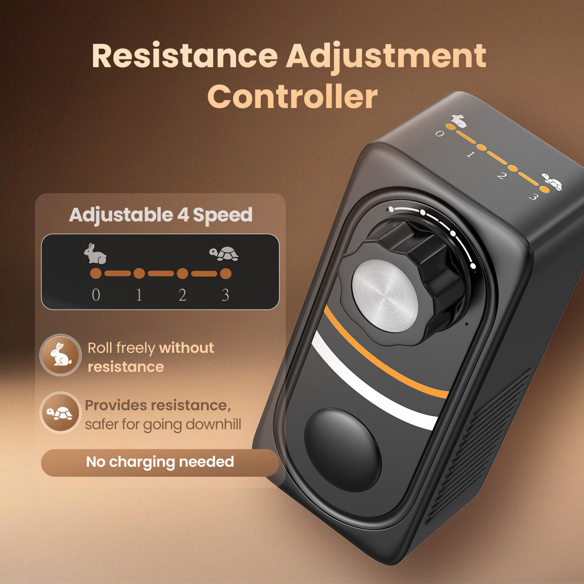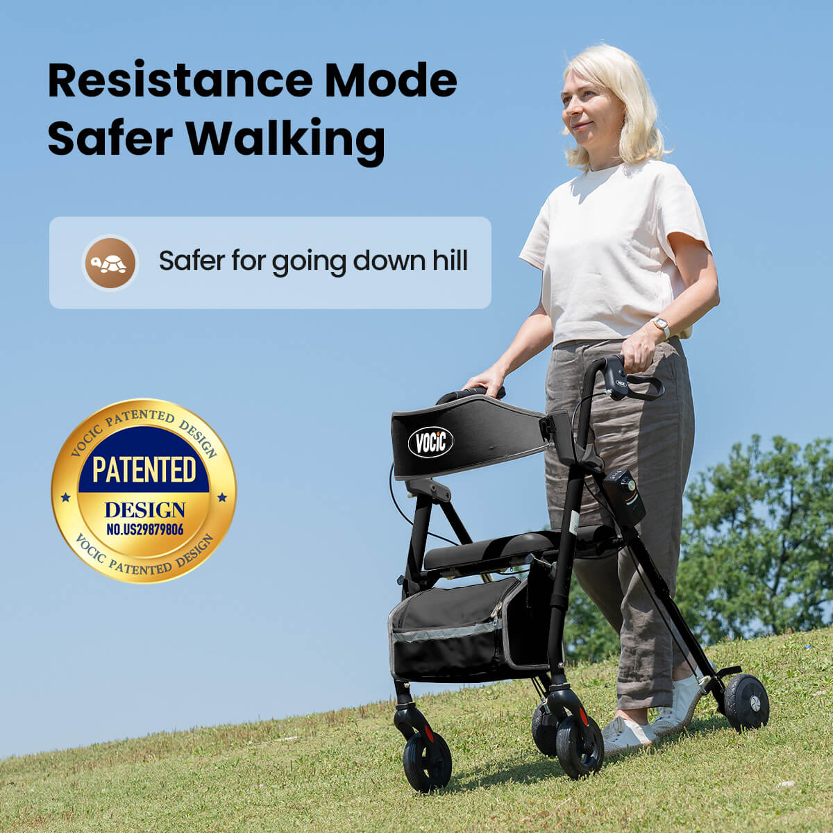 VOCIC Z63 Classic Rollator Walker can easily adjust the damping system across 3 settings to control your pace. Setting 0 glides smoothly on flat ground for daily use. Levels 1-2 provide light support for rehab walks. On downhills, Level 3 adds stability for secure footing on any terrain. Featuring a maintenance-free damping mechanism that requires no charging or batteries.