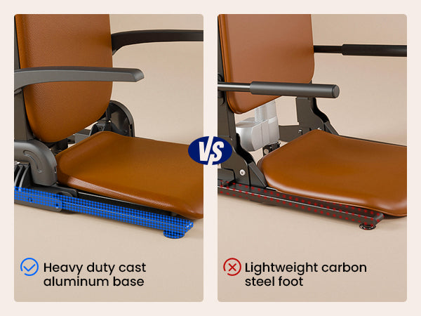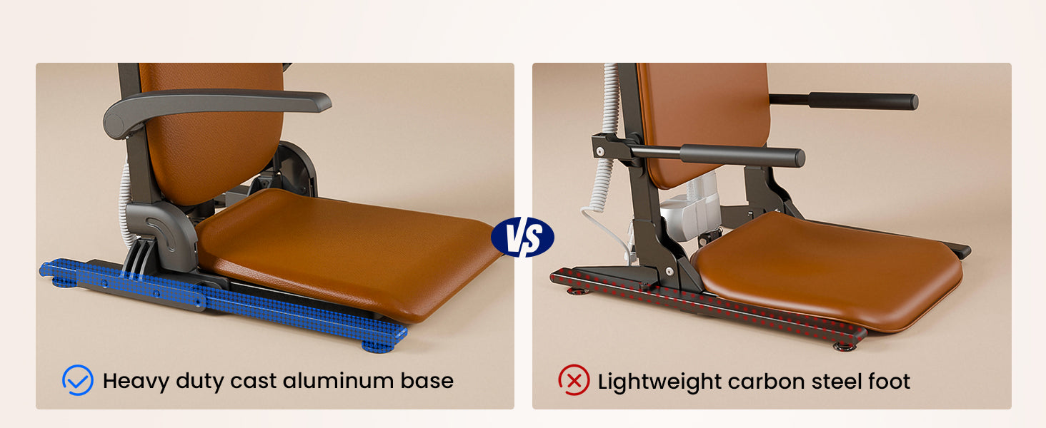 We are pleased to answer your question. Although this chair weighs 48 pounds, it can also carry a large weight, easily supporting a weight of up to 440 pounds, suitable for more people. Additionally, this floor lift chair is equipped with seat belts and dual armrests, providing safer support and helping you stand safer. The base is equipped with small wheels, which can easily move the device when folded, relieving your concerns.
