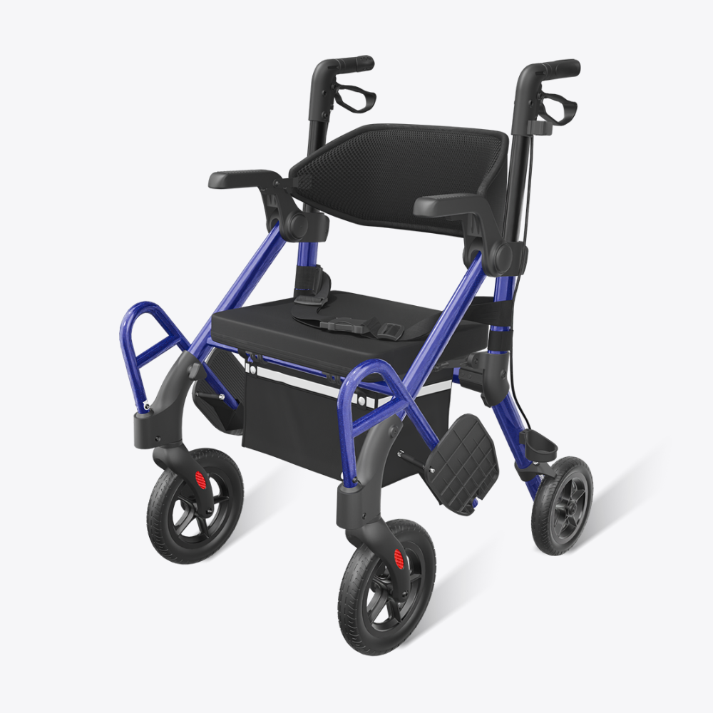 Exclusive 10" wider non-slip wheels with strong overcoming ability. Push the Z55 Walker Wheelchair Combo down gravel roads, slopes, and grassy areas with minimal effort. The no-inflate, no-care rubber tires are shock-absorbing and wear-resistant, providing long-lasting, stable mobility support.