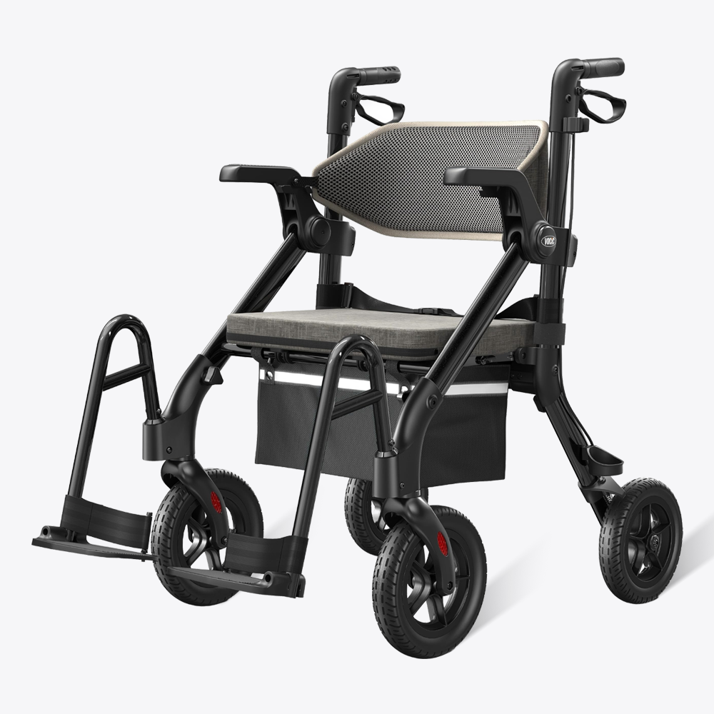 VOCIC's innovative bend-free footrest design solves the traditional pain points of use! Simply lift up the footrest and adjust it to 180°, instantly completing the seamless switch between Rollator and Transport Wheelchair, truly realizing the whole bending-free operation. The patented structural design reduces the burden on the waist from the source, and with the integrated no-detachable storage and crutch traction function, you can change easily and elegantly every time you travel.