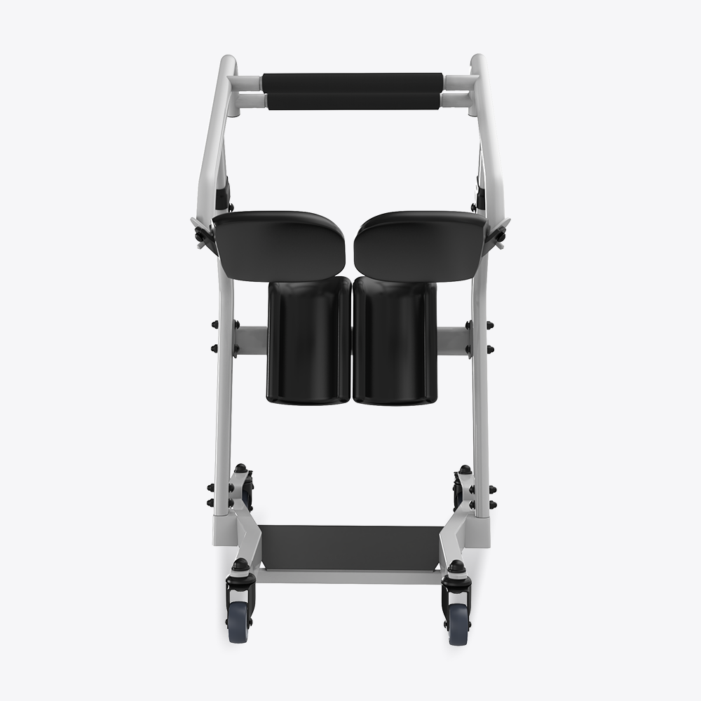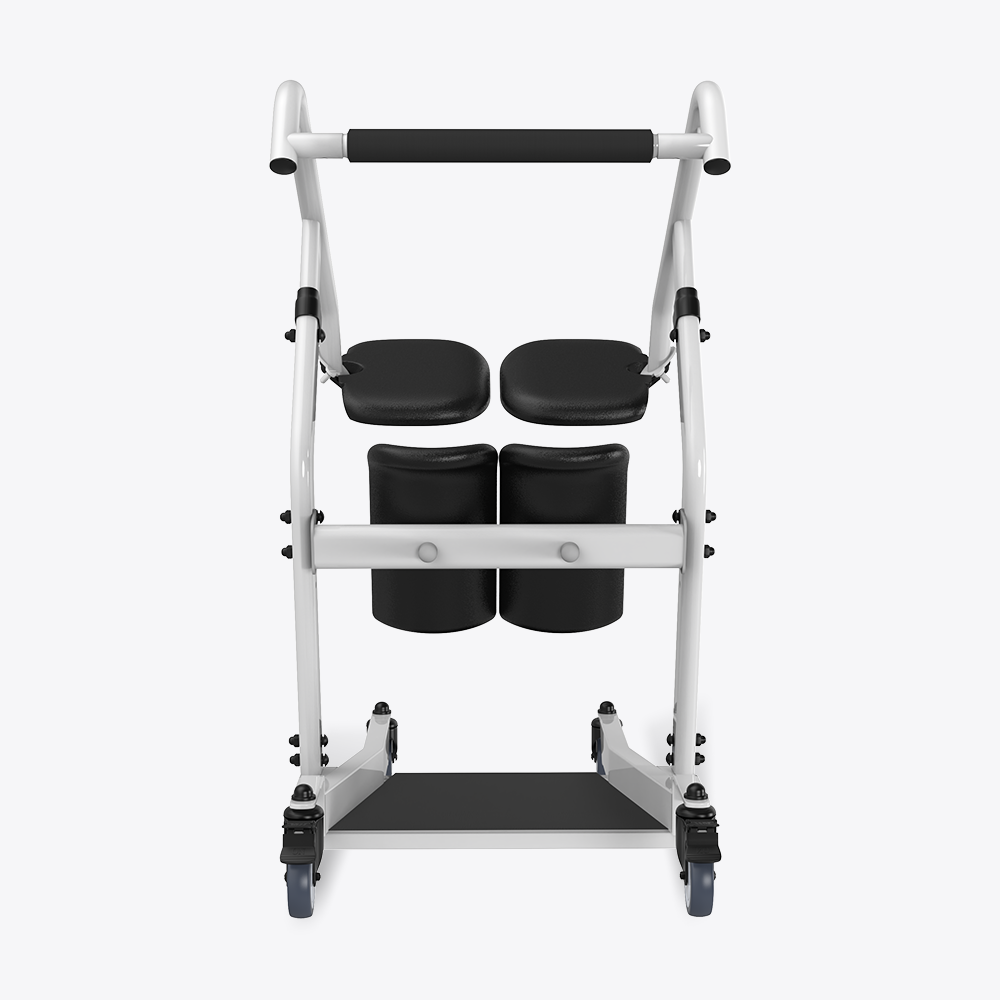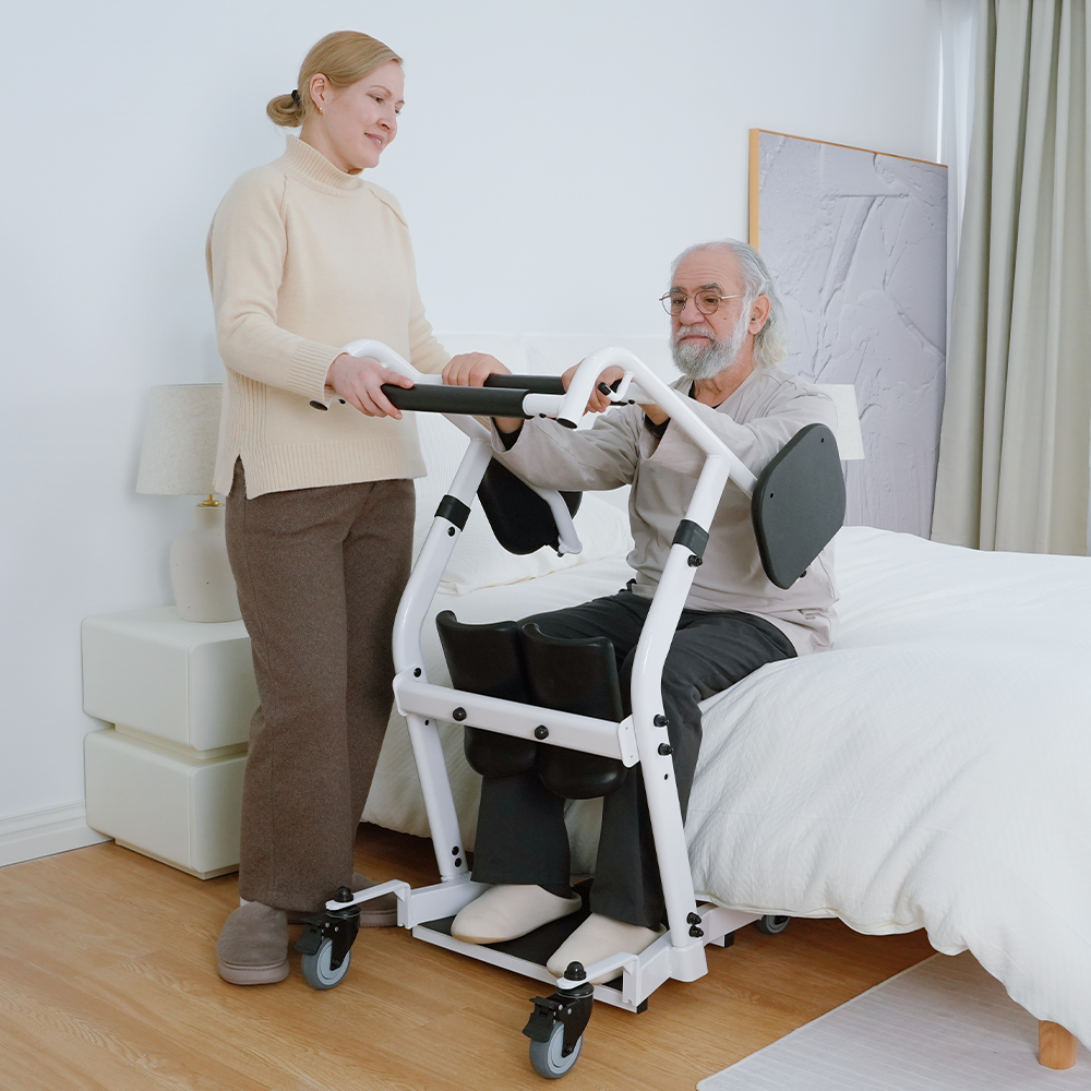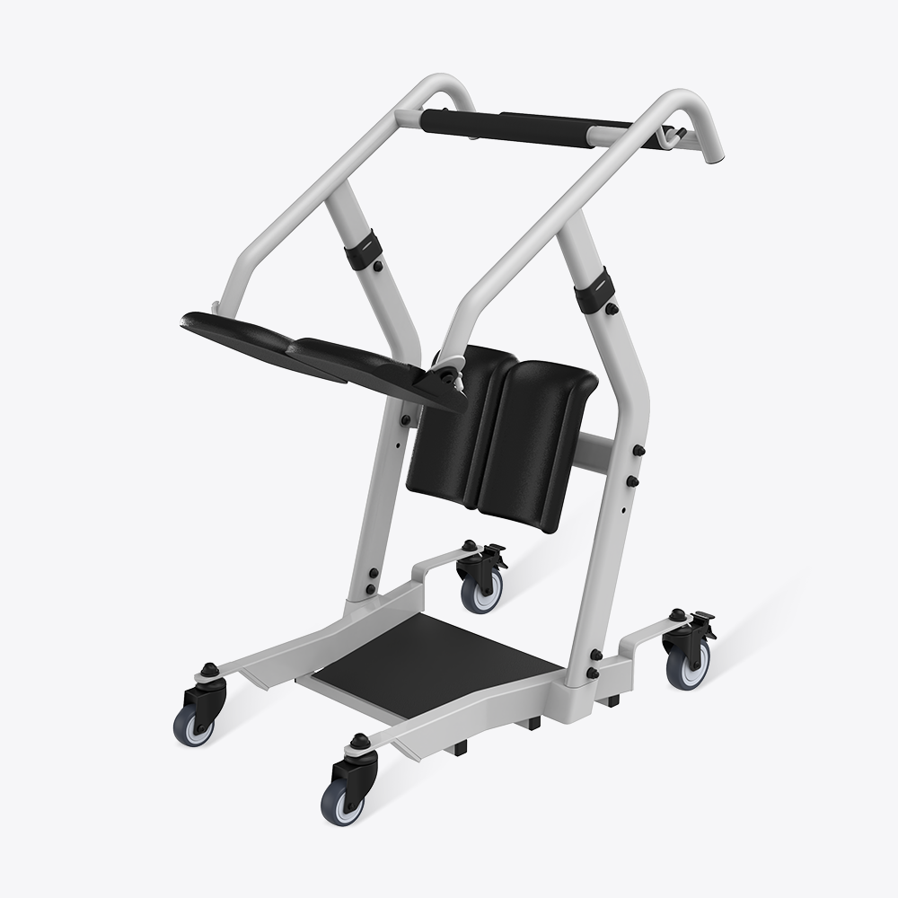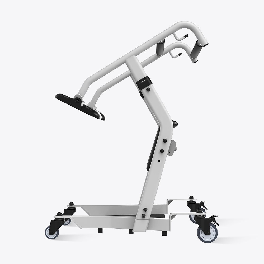 The caregiver locks the wheels, the user places feet on the base.