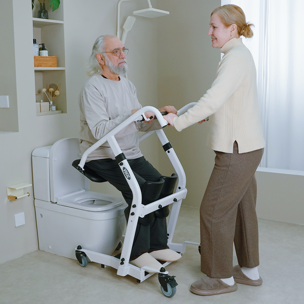 Caregiver helps flip seat pad for user to sit on.